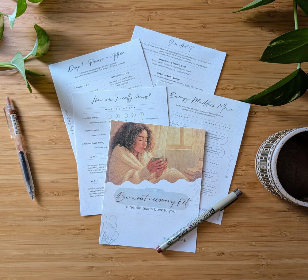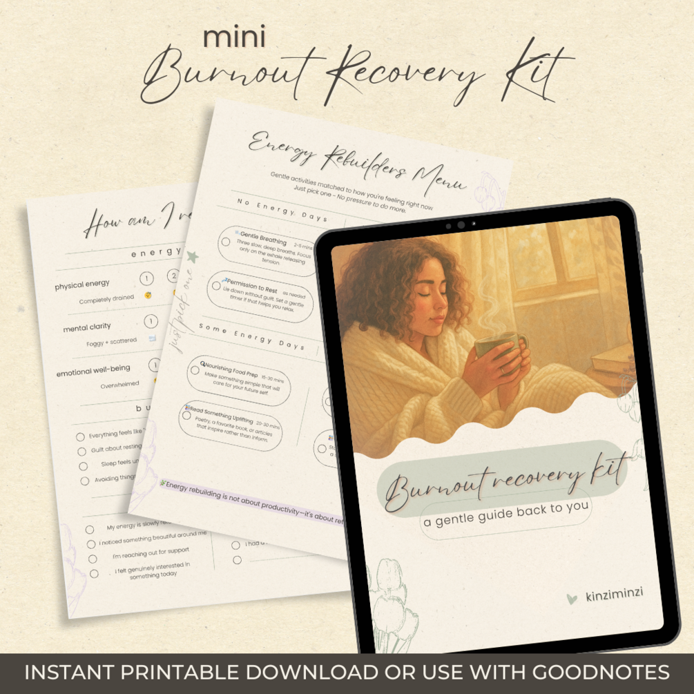 The complete Burnout Recovery Kit is available with 19 pages of gentle check-ins, reset plans, and emotional tools for your healing journey.